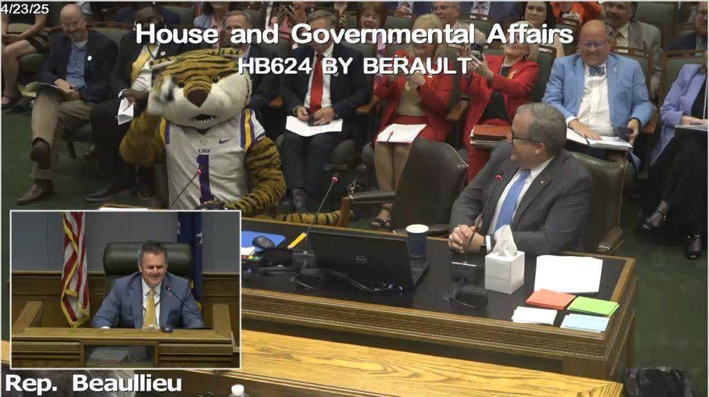Mike the Tiger briefly joins Pelican CEO Daniel Erspamer at the table before the House and Governmental Affairs Committee