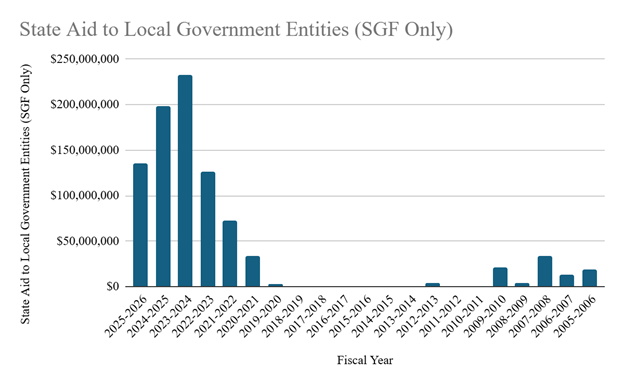 When all was said and done, state aid to local entities appropriated from the SGF in the supplemental appropriations bill totaled nearly $136 million. How these decisions were made remains largely a mystery, with negotiations happening behind the scenes. This longstanding tradition continued with little transparency or accountability, not only raising questions about how priorities were set, but also about how the state tracks these payments.